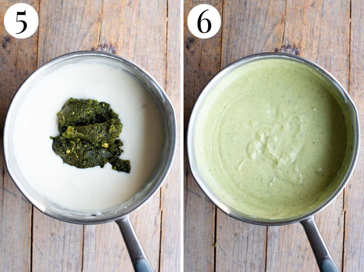• Add the pesto to the bechamel and mix until thoroughly combined.