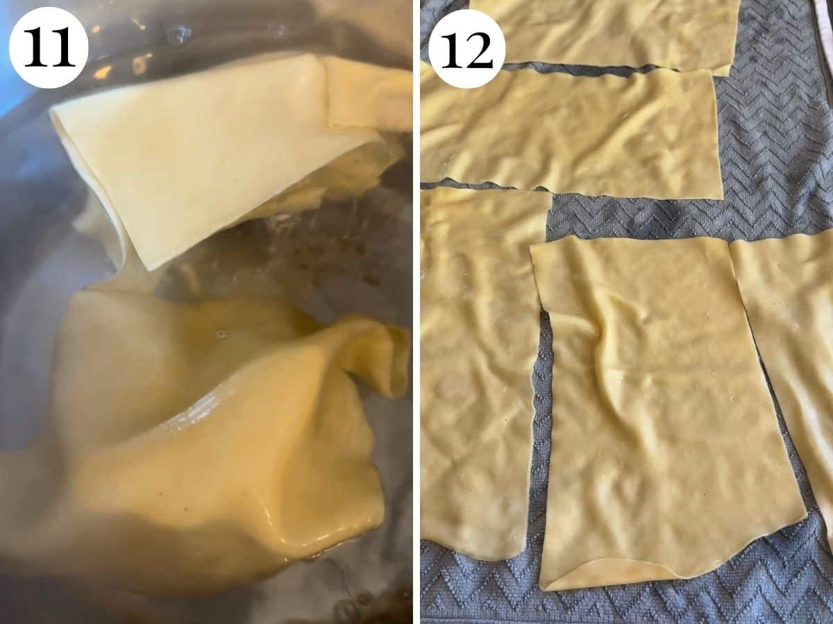• Cut the pasta into sheets the same size as your baking dish (or thereabouts) and blanch them 2-3 at a time for around 30 seconds in the boiling water. Remove carefully with kitchen tongs and lay on a clean kitchen towel to air dry for a few minutes. Continue with the rest of the pasta in batches.