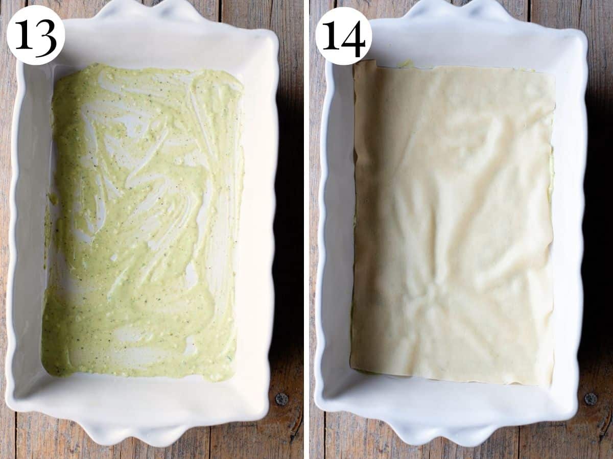 • Spread a large spoonful of pistachio bechamel on the bottom of your 9×13-inch baking dish (you don’t have to use a lot this is just to stop the pasta from sticking).