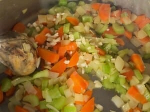 Put 2 tablespoons of olive oil in a large pot. Once hot, add the onion, carrot, and celery and saute gently until softened (about 10 minutes). Add the chopped garlic, chilli flakes and a pinch of salt and pepper and saute for 30-40 seconds.