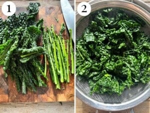 Meanwhile, trim the hardy middle stalks from the cavolo nero, wash it and roughly chop it. When the water is boiling, boil the cavolo nero for around 3-4 minutes until wilted. Drain in a sieve and set aside.